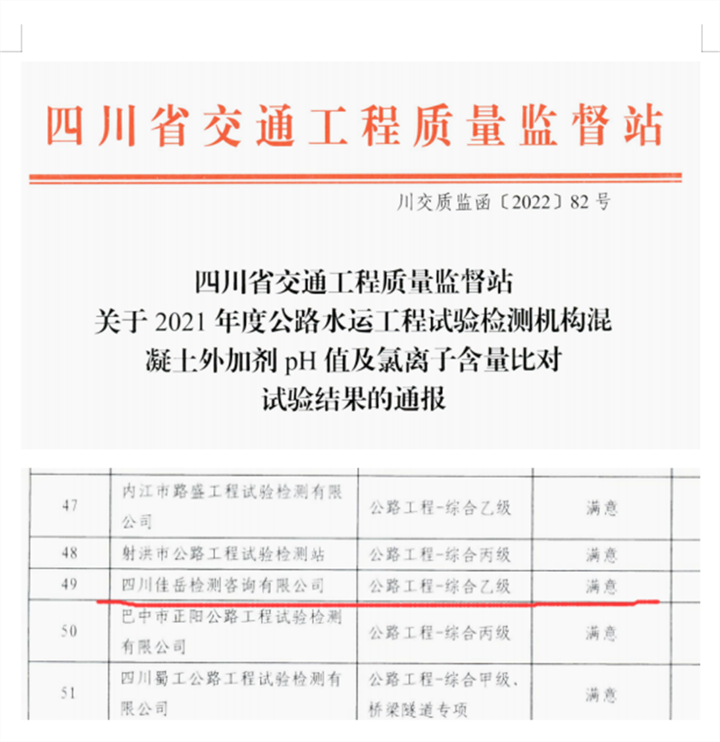 5月11日,四川省交通工程質(zhì)量監(jiān)督站印發(fā)《關(guān)于2021年度公路水運(yùn)工程試驗(yàn)檢測(cè)機(jī)構(gòu)混凝土外加劑PH值及氯離子含量比對(duì)試驗(yàn)結(jié)果的通報(bào),交建集團(tuán)四川佳岳檢測(cè)咨詢(xún)有限公司獲得“滿意”評(píng)價(jià)。