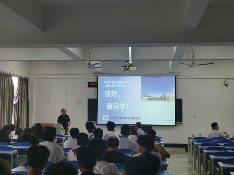 為深化校企合作,促進合作內(nèi)容全面落實落地、交流融合,近日,交建集團四川佳岳檢測公司應(yīng)邀參加成都農(nóng)業(yè)科技職業(yè)學(xué)院城鄉(xiāng)建設(shè)學(xué)院市政班入學(xué)專業(yè)教育分享會。佳岳公司檢測技術(shù)部工程師侯濤在會上作分享交流。