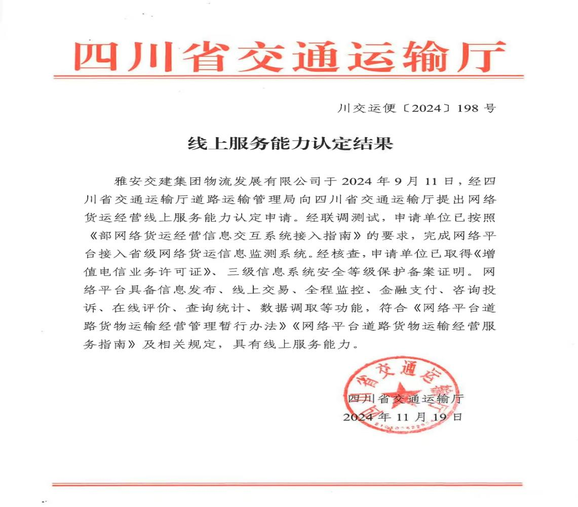 近日,《四川省交通運(yùn)輸廳線上服務(wù)能力認(rèn)定結(jié)果》發(fā)布,雅安交建集團(tuán)物流發(fā)展有限公司正式取得網(wǎng)絡(luò)貨運(yùn)經(jīng)營線上服務(wù)能力認(rèn)定,標(biāo)志著雅安首家國企網(wǎng)絡(luò)貨運(yùn)平臺(tái)即將面向市場(chǎng)運(yùn)營。