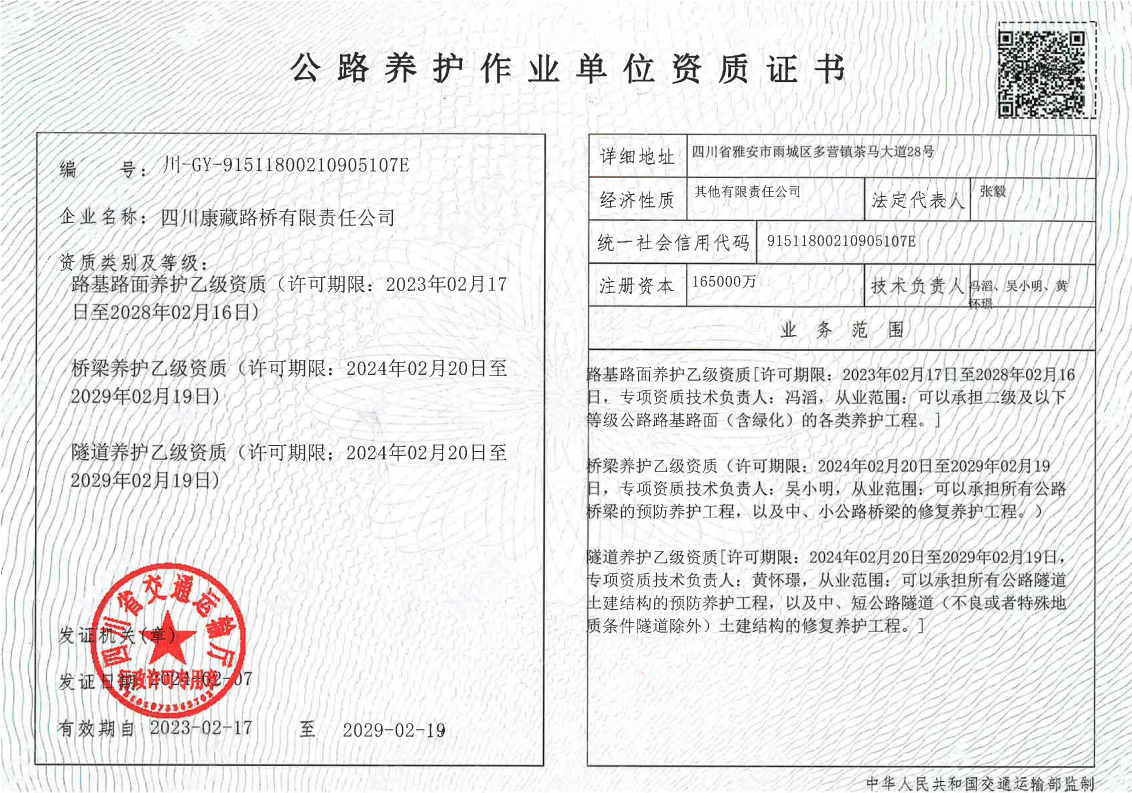 近日,雅安市交通建設(集團)有限責任公司通過自主申報,成功通過四川省交通運輸廳公路養(yǎng)護作業(yè)單位資質評審,完成公路養(yǎng)護作業(yè)單位資質增項,新增橋梁養(yǎng)護乙級、隧道養(yǎng)護乙級兩項資質。