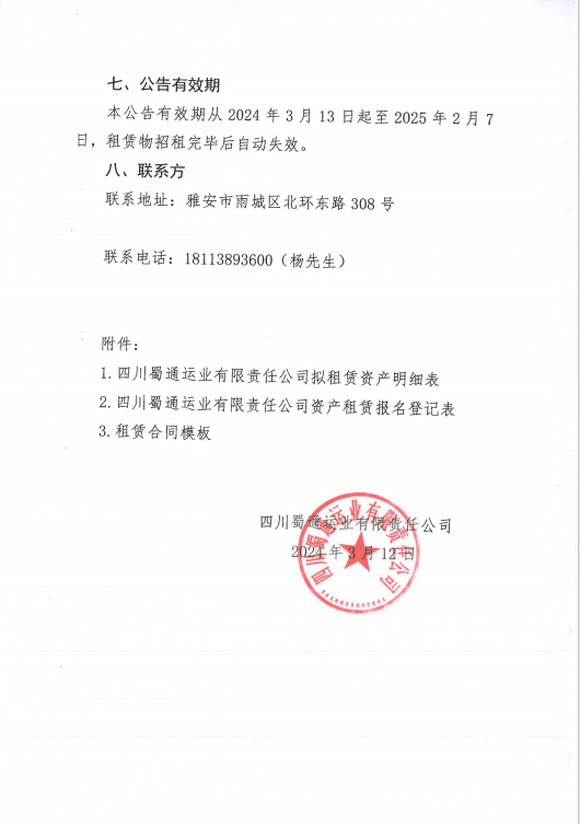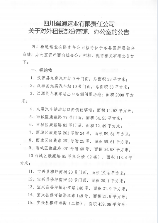 四川蜀通運(yùn)業(yè)有限責(zé)任公司關(guān)于對(duì)外租賃部分門(mén)面、辦公室資產(chǎn)的公告附件