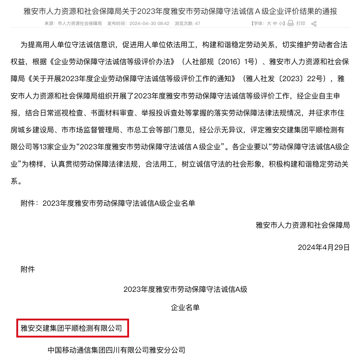 近日,雅安市人社局發(fā)布通報,雅安交建集團平順公司被評定為“2023年度雅安市勞動保障守法誠信A級企業(yè)”。此次評選由人社局結合日常巡視檢查、書面材料審查、舉報投訴查處以及專項檢查等活動掌握的落實勞動保障法律法規(guī)情況,并征求市場監(jiān)管局等部門和單位意見后,綜合評定而出。