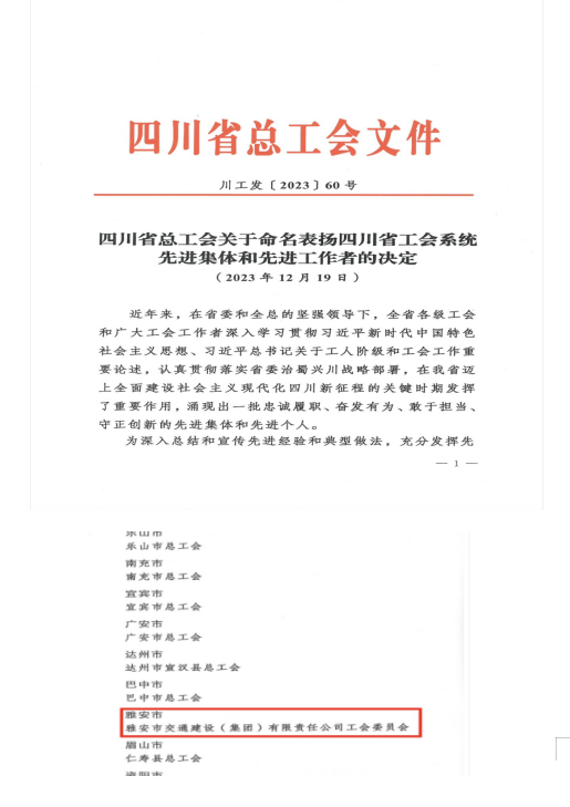 12月19日,四川省總工會將雅安市交通建設(shè)(集團)有限責(zé)任公司工會委員會命名表揚為“四川省工會系統(tǒng)先進(jìn)集體”。