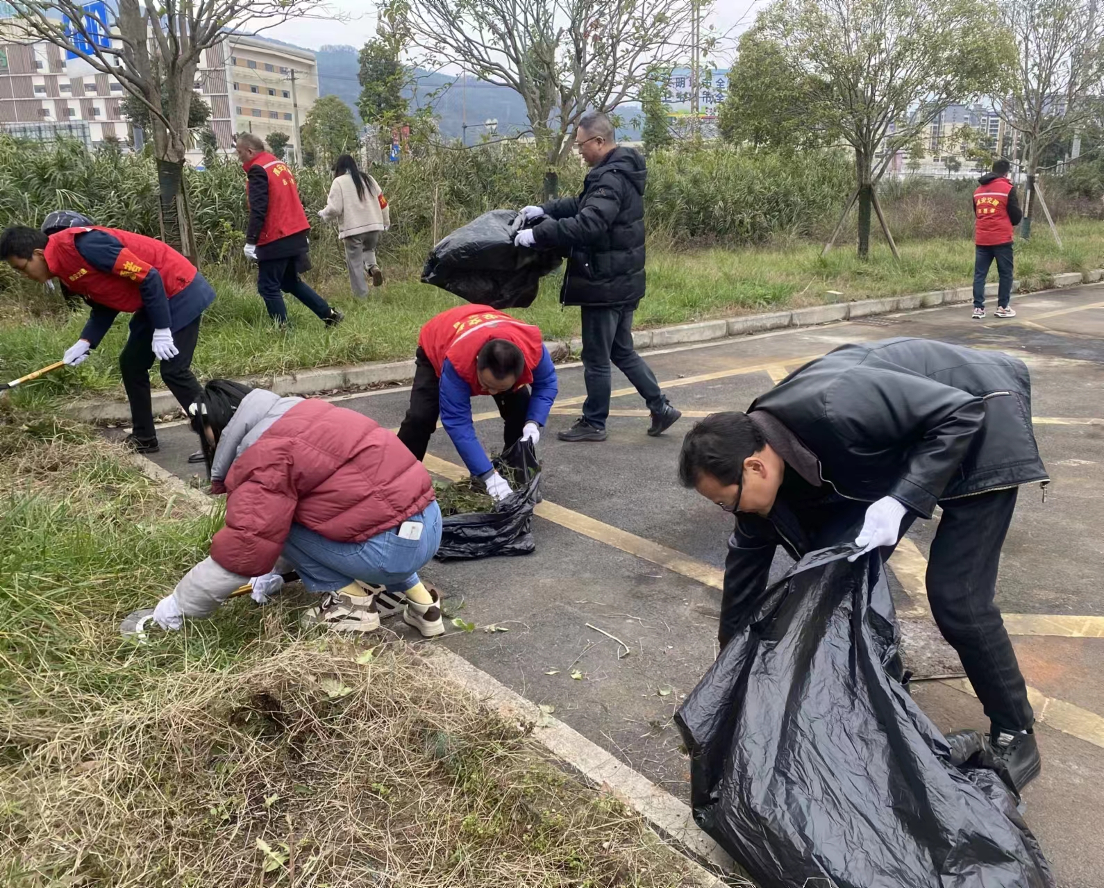 活動(dòng)中,20余名黨員、入黨積極分子、團(tuán)員身著紅馬甲,肩戴紅袖章,手持鐮刀、垃圾袋等清潔工具,以小組的形式,明確分工,對(duì)大興街道興貿(mào)路A段綠化帶雜草進(jìn)行清理,并撿拾各種紙屑、廢棄塑料袋等垃圾。
