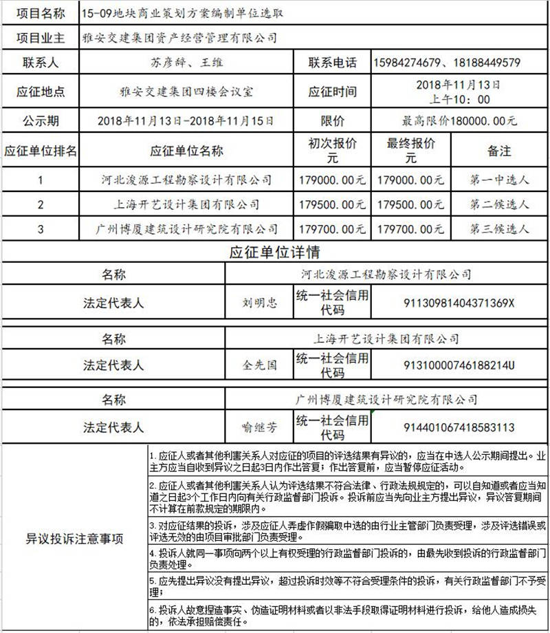雅安交建集團資產經營管理有限公司15-09地塊商業(yè)策劃方案編制單位選取結果公示