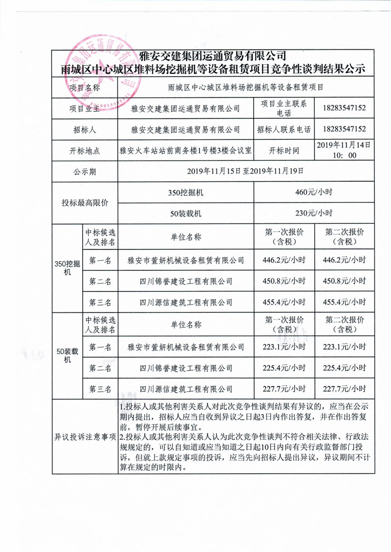 雅安交建集團(tuán)運(yùn)通貿(mào)易有限公司雨城區(qū)中心城區(qū)堆料場(chǎng)挖掘機(jī)等設(shè)備租賃項(xiàng)目競爭性談判結(jié)果公示