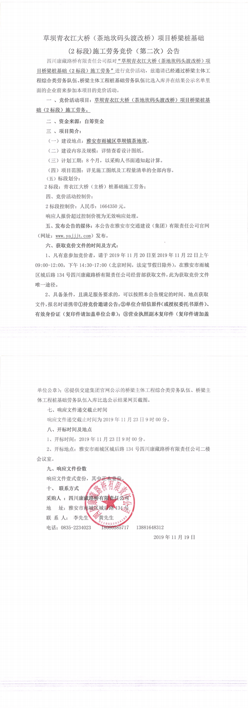 四川康藏路橋有限責(zé)任公司草壩青衣江大橋(茶地坎碼頭渡改橋)項目橋梁樁基礎(chǔ)(2標段)施工勞務(wù)競價(第二次)公告