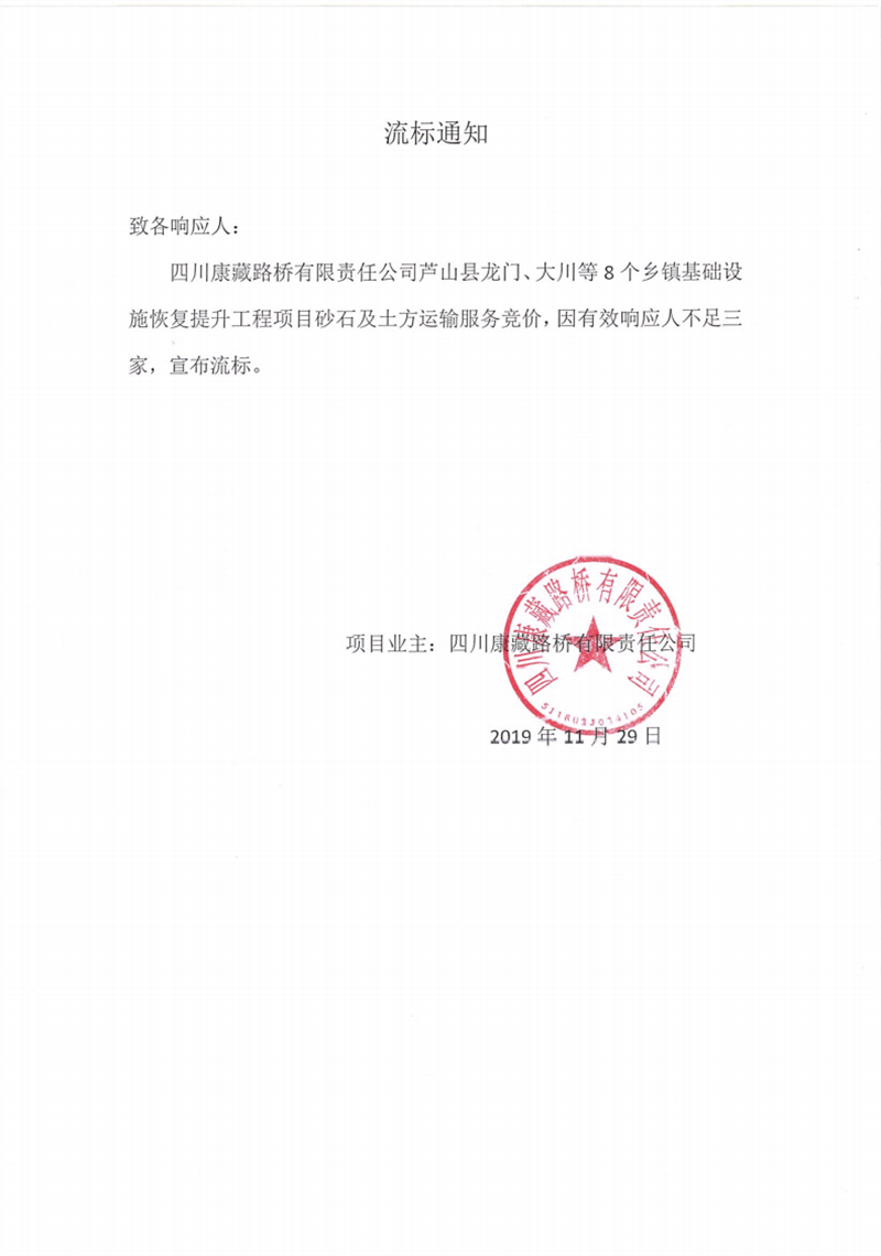 四川康藏路橋有限責(zé)任公司蘆山縣龍門、大川等8個鄉(xiāng)鎮(zhèn)基礎(chǔ)設(shè)施恢復(fù)提升工程項目砂石及土方運輸服務(wù)競價流標(biāo)通知