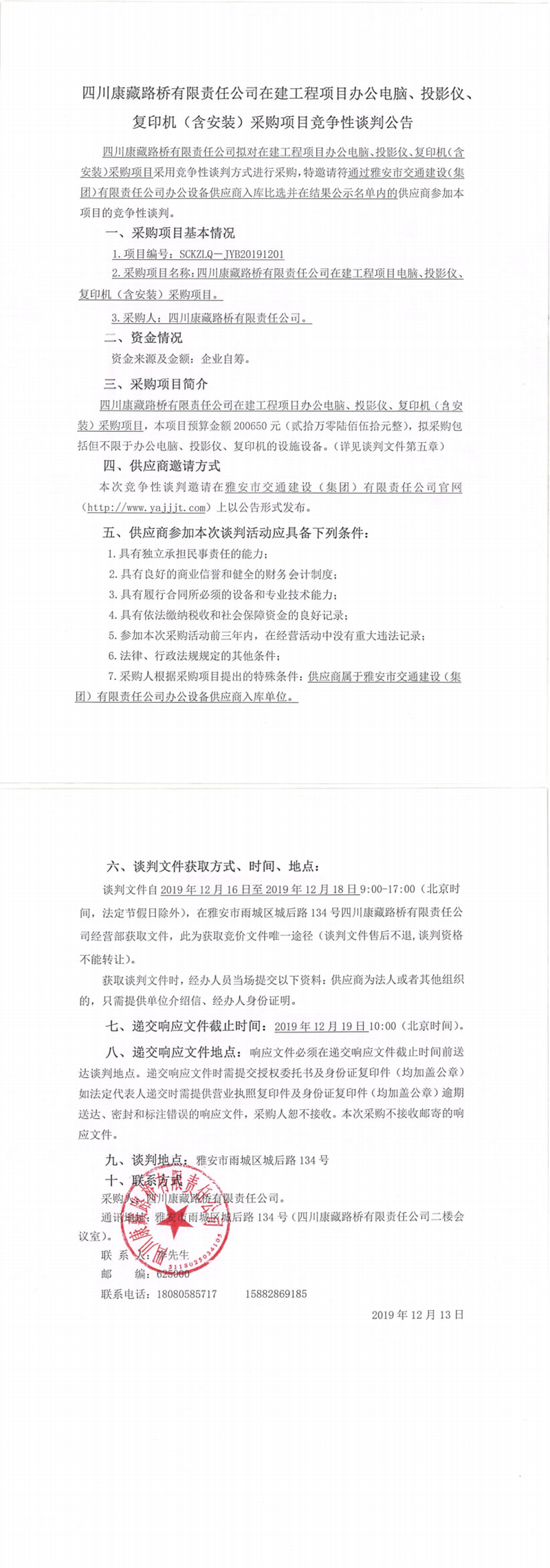 四川康藏路橋有限責任公司在建工程項目辦公電腦、投影儀、復(fù)印機(含安裝)采購項目競爭性談判公告