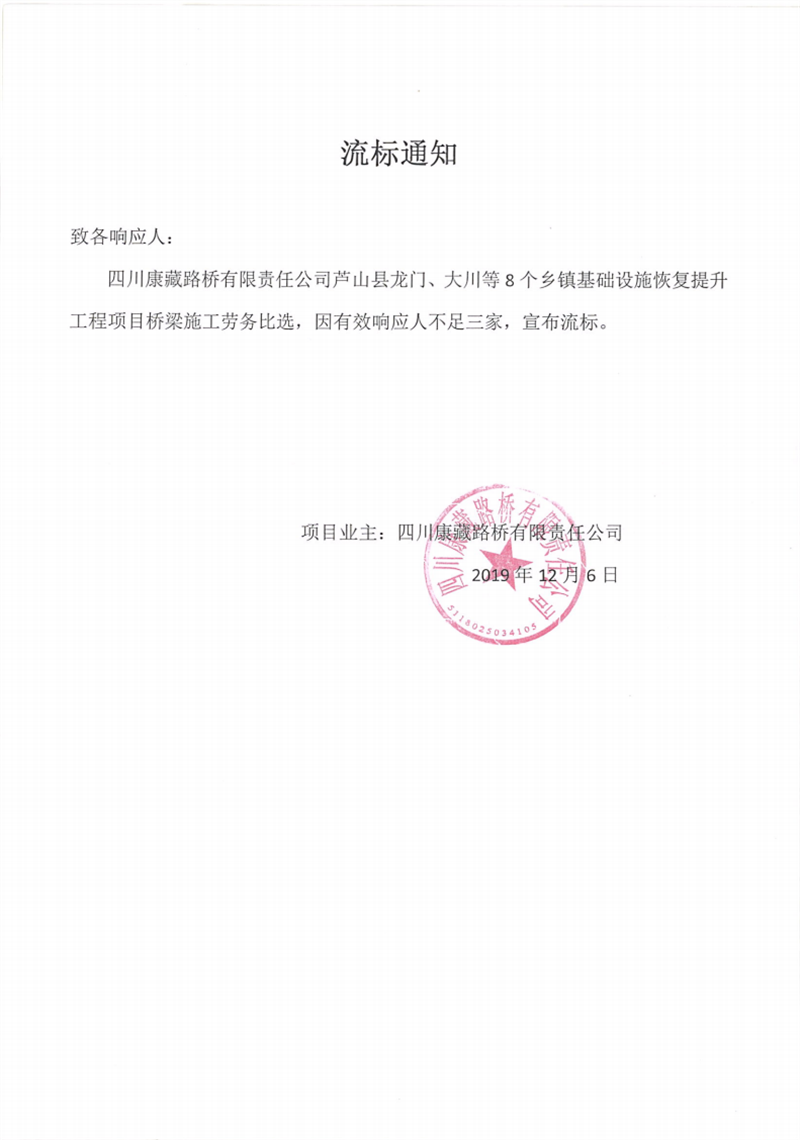 四川康藏路橋有限責(zé)任公司蘆山縣龍門、大川等8個鄉(xiāng)鎮(zhèn)基礎(chǔ)設(shè)施恢復(fù)提升工程項(xiàng)目橋梁施工勞務(wù)比選流標(biāo)通知