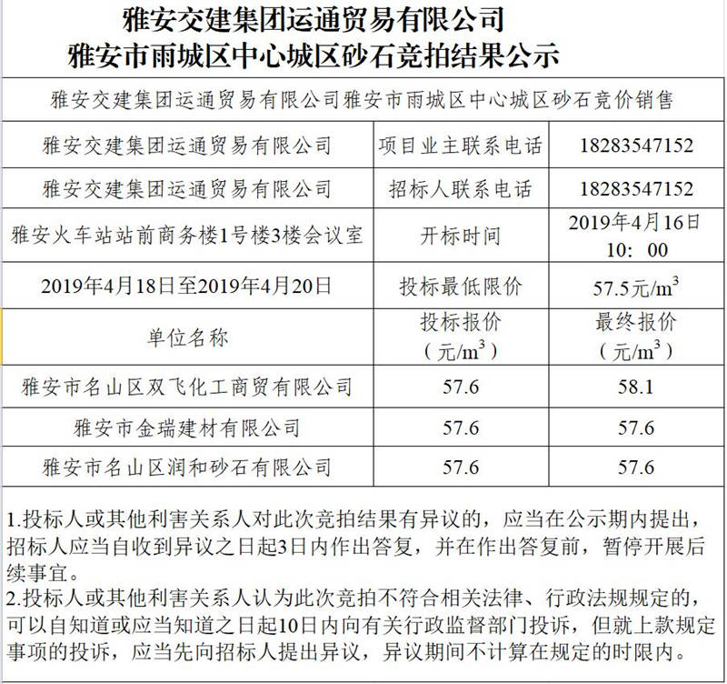 雅安交建集團運通貿易有限公司中心城區(qū)砂石競拍結果公示