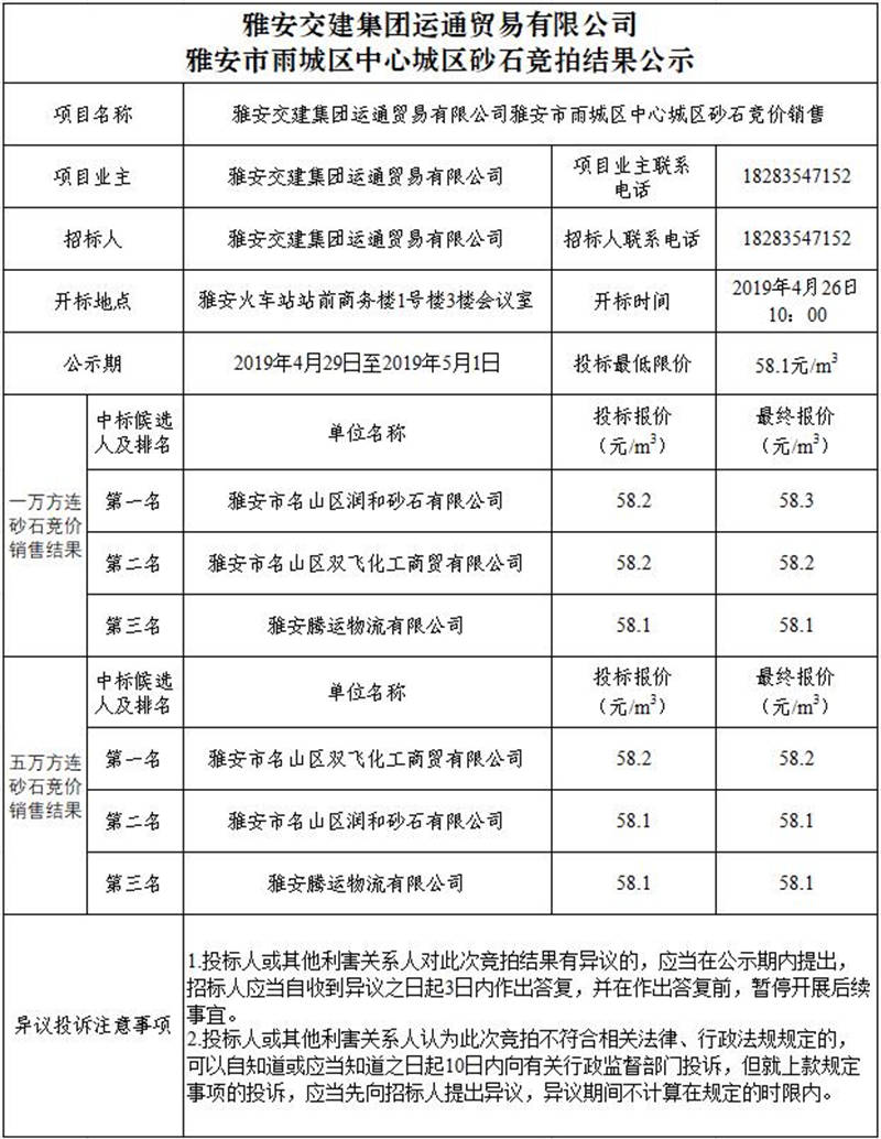 雅安交建集團(tuán)運通貿(mào)易有限公司雨城區(qū)中心城區(qū)砂石競拍結(jié)果公示