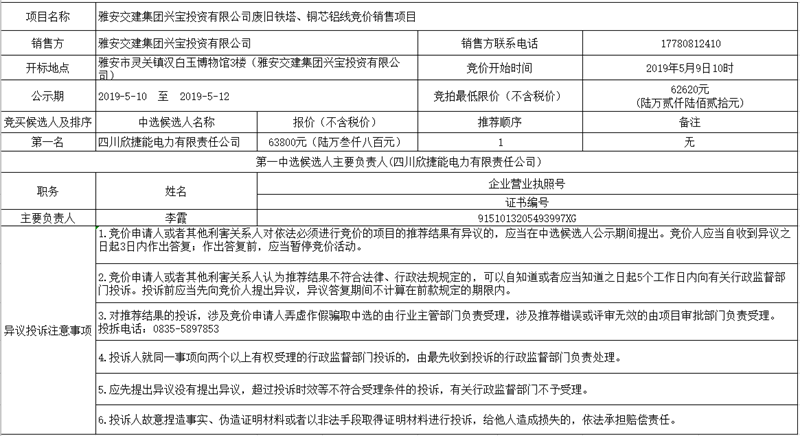 雅安交建集團(tuán)興寶投資有限公司廢舊鐵塔、銅芯鋁線競價(jià)銷售項(xiàng)目公示