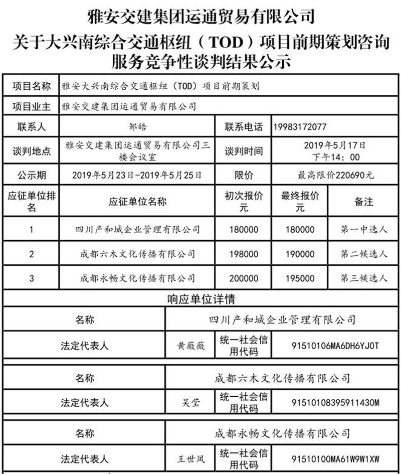 雅安交建集團(tuán)運(yùn)通貿(mào)易有限公司關(guān)于大興南綜合樞紐(TOD)項(xiàng)目前期策劃咨詢服務(wù)競(jìng)爭(zhēng)性談判結(jié)果公司