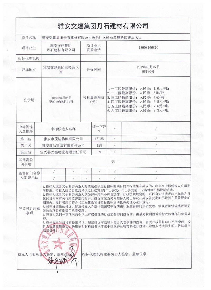 雅安交建集團丹石建材有限公司魚泉廠區(qū)砂石及原料的轉(zhuǎn)運隊伍項目競價結(jié)果公示