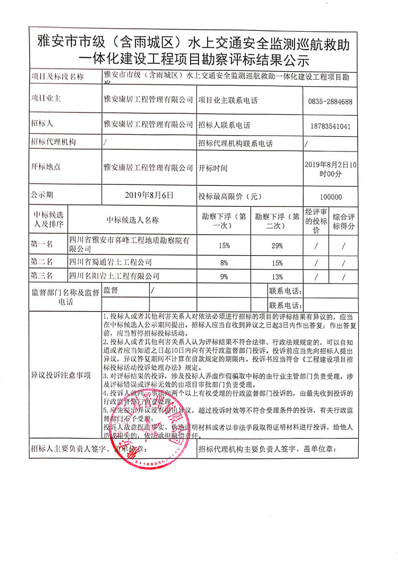 雅安康居工程管理有限公司雅安市市級(jí)(含雨城區(qū))水上交通安全監(jiān)測(cè)巡航救助一體化建設(shè)工程項(xiàng)目勘察評(píng)標(biāo)結(jié)果公示