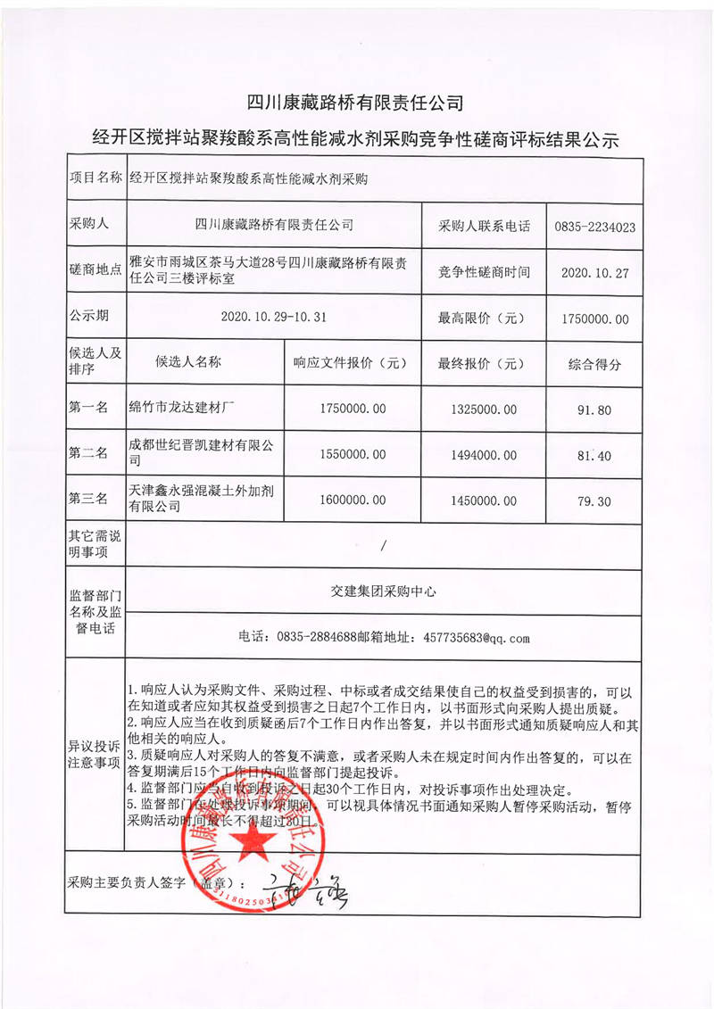 四川康藏路橋有限責任公司經(jīng)開區(qū)攪攔站聚羧酸系高性能減水劑采購競爭性磋商評標結果公示