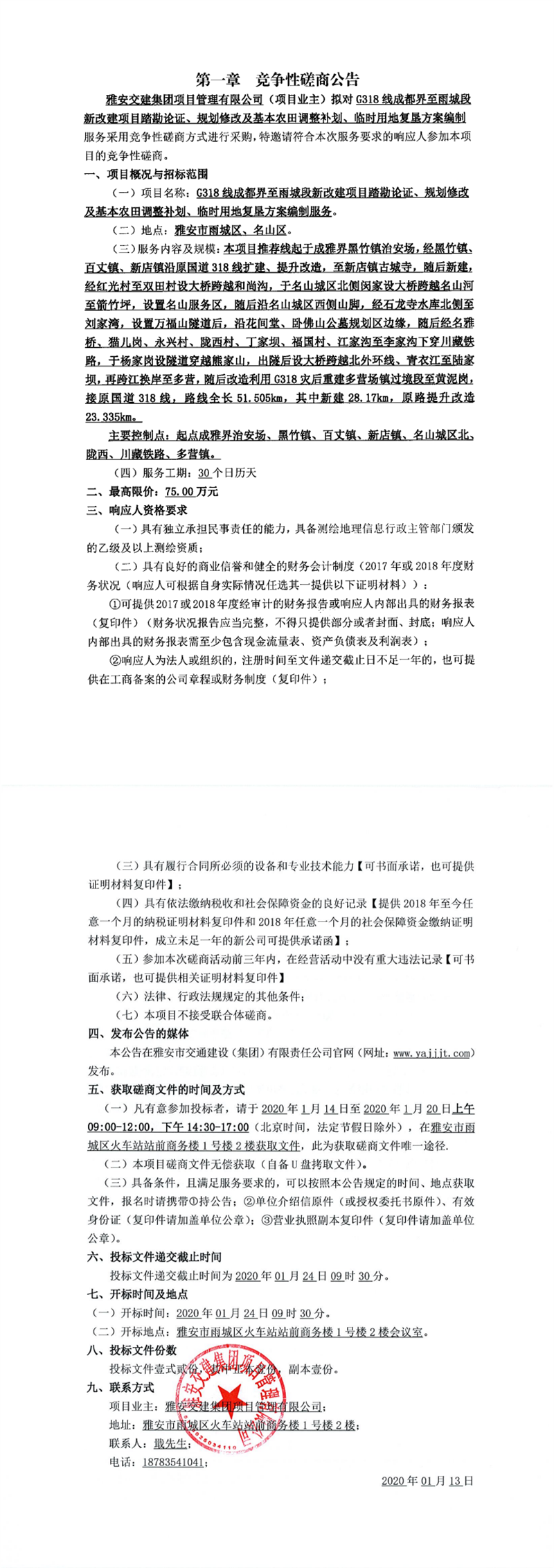 雅安交建集團項目管理有限公司G318線成都界至雨城段新改建項目踏勘論證、規(guī)劃修改及基本農(nóng)田調(diào)整補劃、臨地用地復墾方案編制服務(wù)競爭性磋商公告