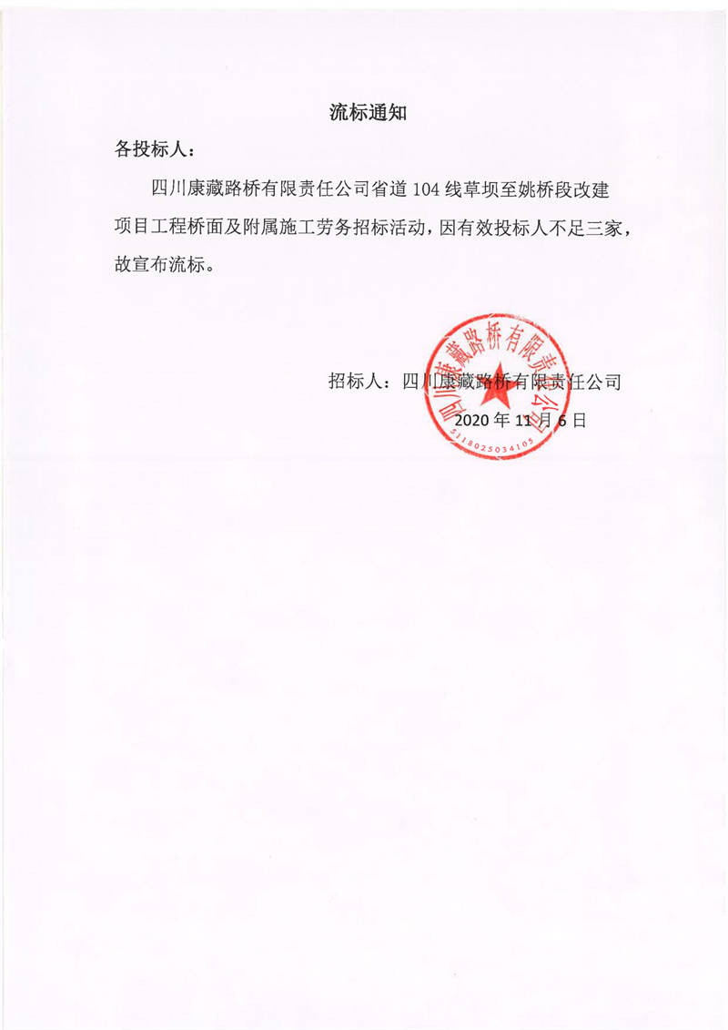 四川康藏路橋有限責任公司省道104線草壩至姚橋段改建項目工程橋面及附屬施工勞務流標通知
