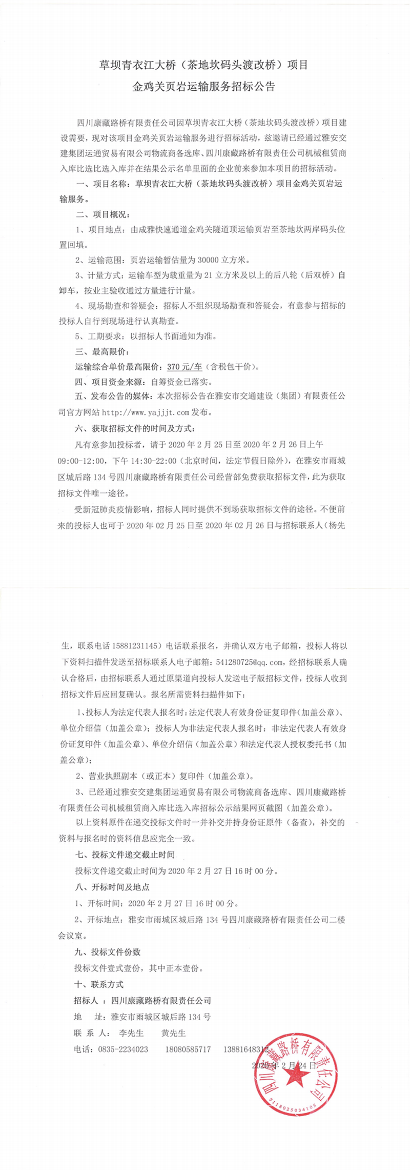 四川康藏路橋有限責(zé)任公司草壩青衣江大橋(茶地坎碼頭渡改橋)項(xiàng)目金雞關(guān)頁巖運(yùn)輸服務(wù)招標(biāo)公告