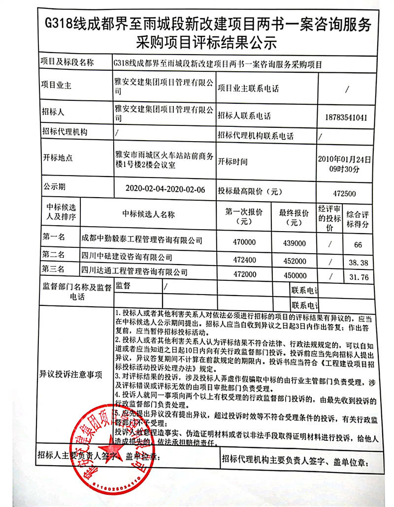 雅安交建集團(tuán)項(xiàng)目管理有限公司G318線成都界至雨城段新改建項(xiàng)目勘測(cè)定界服務(wù)采購(gòu)項(xiàng)目評(píng)標(biāo)結(jié)果公示