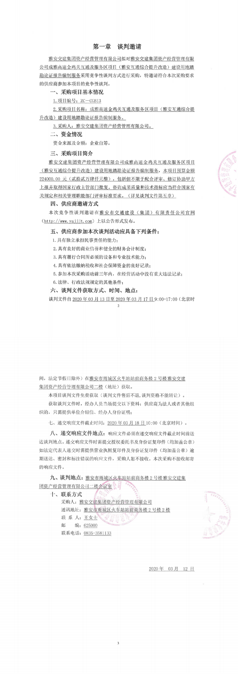 雅安交建集團資產(chǎn)經(jīng)營管理有限公司成雅高速金雞關互通及服務區(qū)項目(雅安互通綜合提升改造)建設用地踏勘論證報告編制服務競爭性談判公告