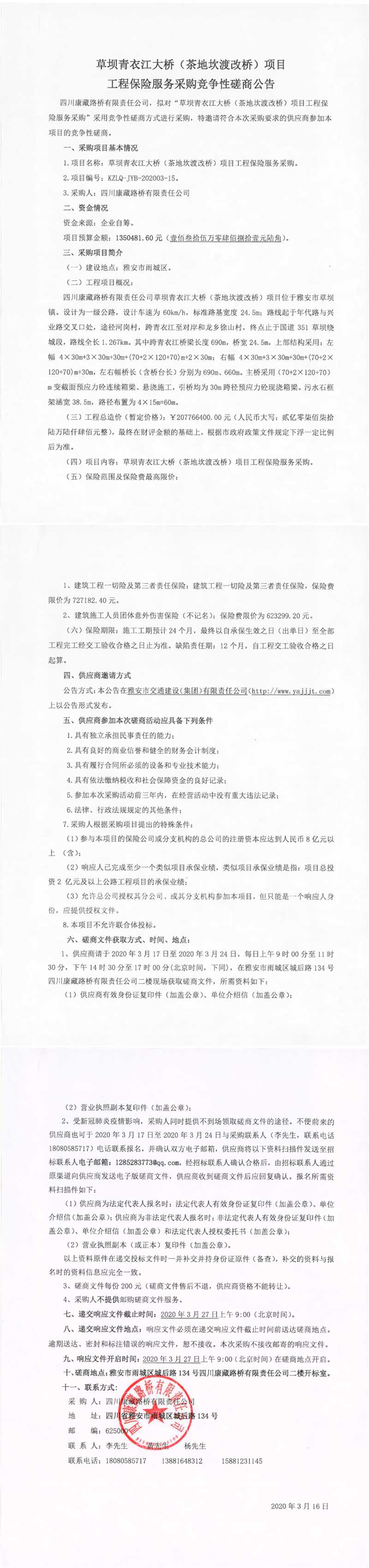 四川康藏路橋有限責任公司草壩青衣江大橋(茶地坎渡改橋)項目工程保險服務采購競爭性磋商公告