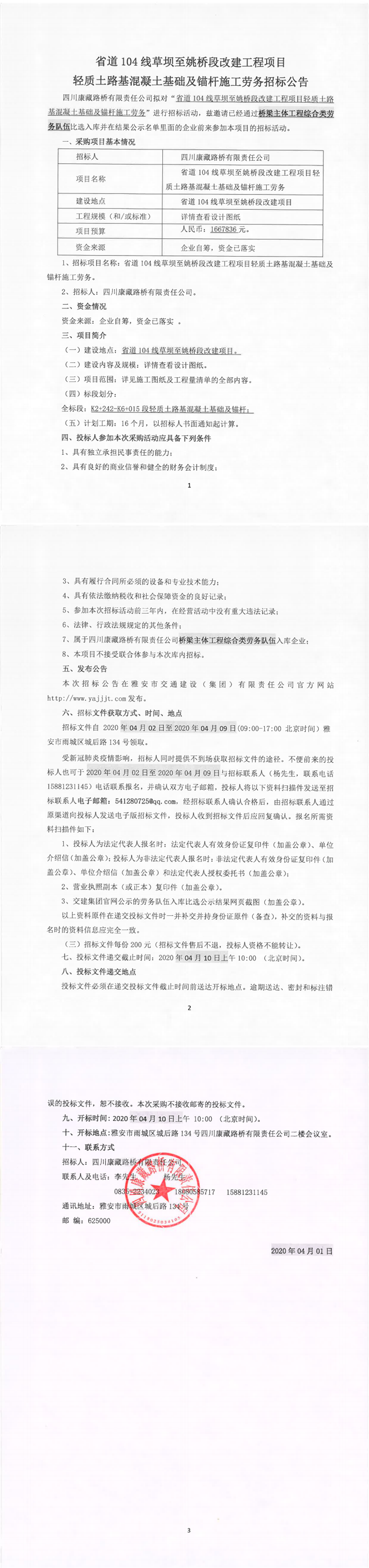 四川康藏路橋有限責任公司省道104線草壩至姚橋段改建工程項目輕質(zhì)土路基混凝土基礎(chǔ)及錨桿施工勞務招標公告