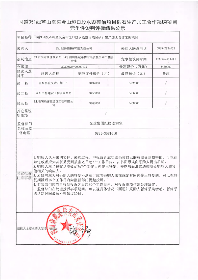 四川康藏路橋有限責任公司國道351線蘆山至夾金山埡口段水毀整治項目砂石生產加工合作采購項目競爭性談判評標結果公示