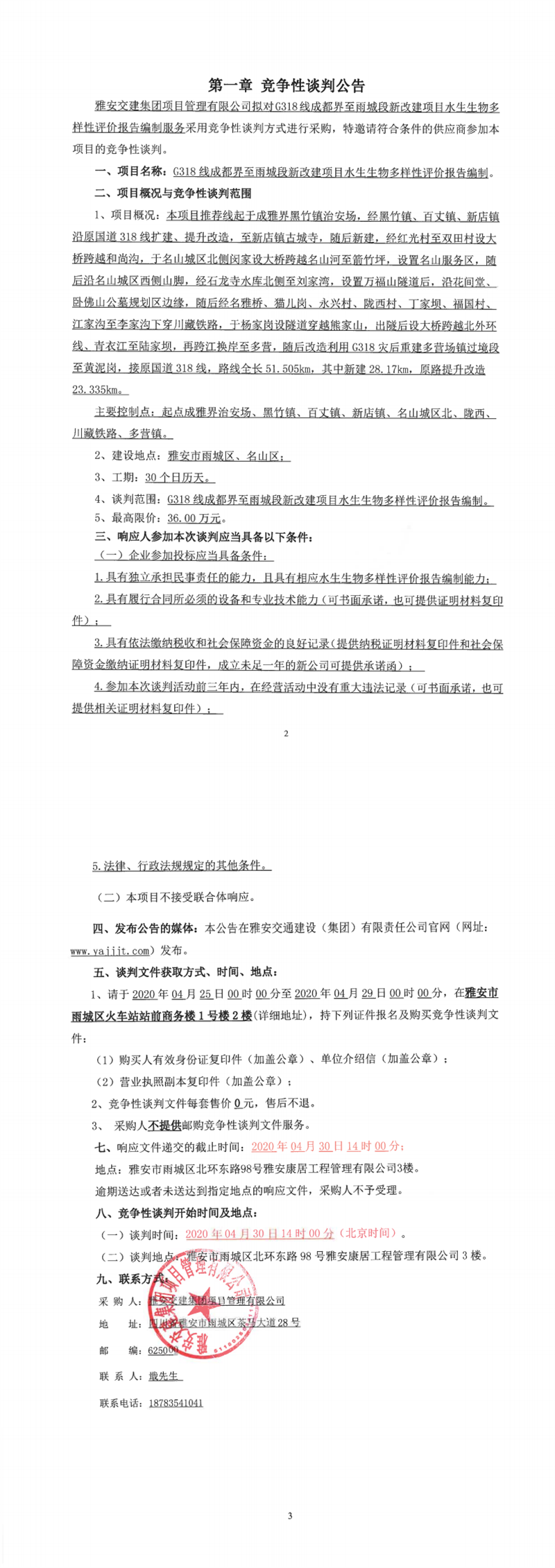 雅安交建集團(tuán)項(xiàng)目管理有限公司G318線成都界至雨城段新改建項(xiàng)目陸生生物多樣性影響評(píng)價(jià)編制競爭性談判公告