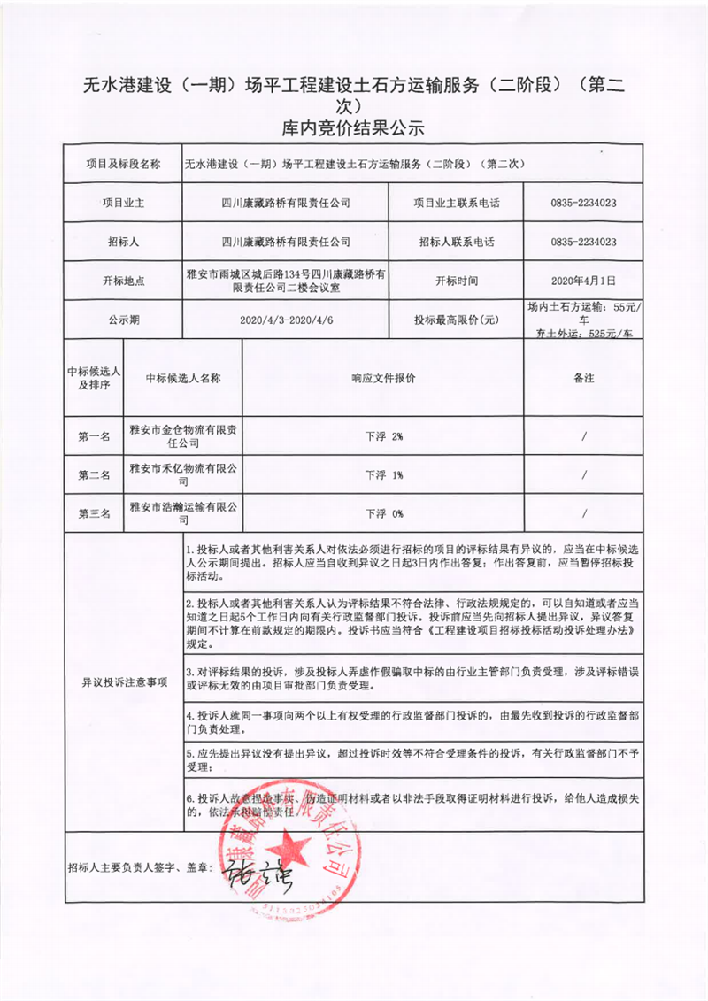 四川康藏路橋有限責任公司無水港建設(shè)(一期)場平工程土石方運輸服務(二階段)(第二次)庫內(nèi)競價結(jié)果公示