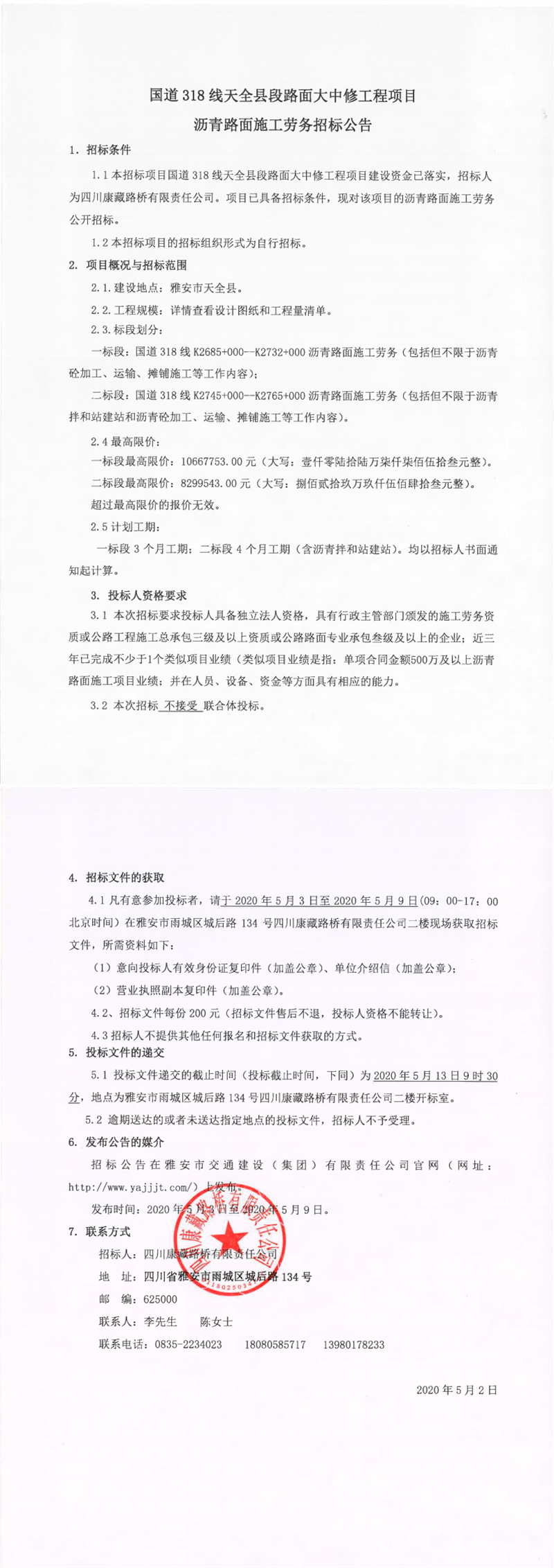 四川康藏路橋有限責(zé)任公司國道318線天全縣段路面大中修工程項目瀝青路面施工勞務(wù)招標公告