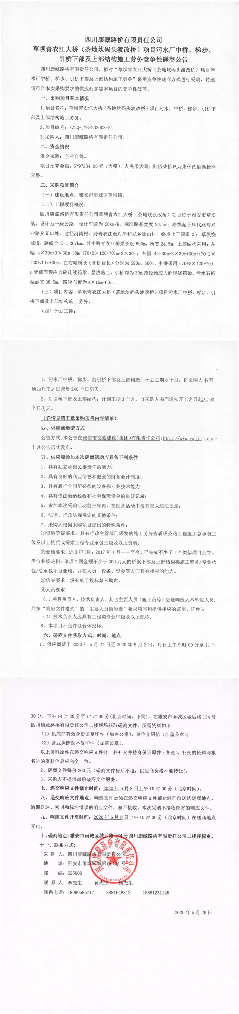 四川康藏路橋有限責(zé)任公司草壩青衣江大橋(茶地坎碼頭渡改橋)項目污水廠中橋、梯步、引橋下部及上部結(jié)構(gòu)施工勞務(wù)競爭性磋商公告