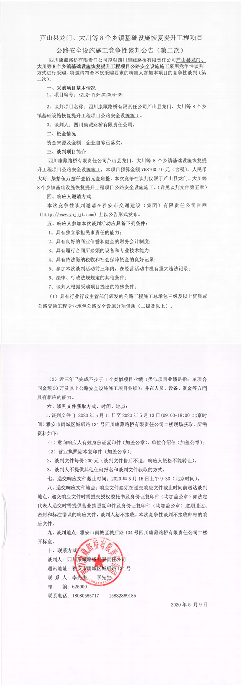 四川康藏路橋有限責(zé)任公司蘆山縣龍門、大川等8個鄉(xiāng)鎮(zhèn)基礎(chǔ)設(shè)施恢復(fù)提升工程項(xiàng)目公路安全設(shè)施施工競爭性談判公告(第二次)