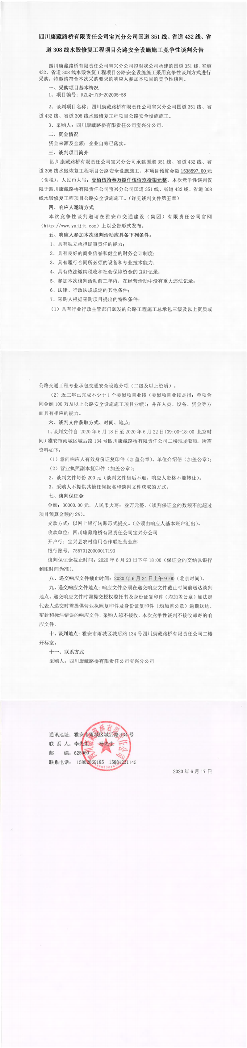 四川康藏路橋有限責(zé)任公司寶興分公司國道351線、省道432線、省道308線水毀修復(fù)工程項(xiàng)目公路安全設(shè)施施工競爭性談判公告