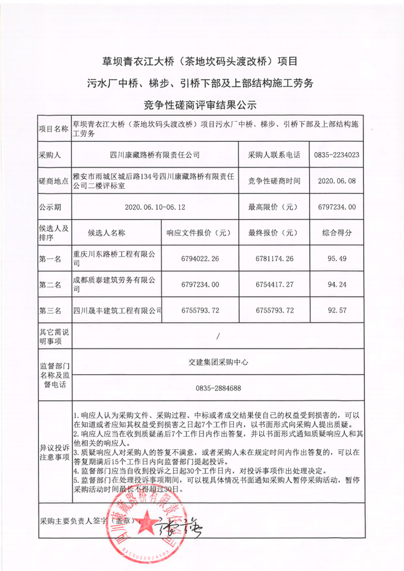 四川康藏路橋有限責(zé)任公司草壩青衣江大橋(茶地坎碼頭渡改橋)項目污水廠中橋、梯步、引橋下部及上部結(jié)構(gòu)施工勞務(wù)競爭性磋商評審結(jié)果公示