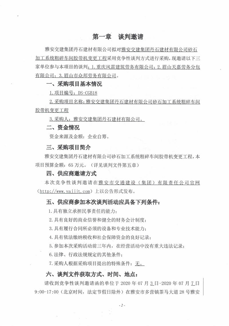 雅安交建集團丹石建材有限公司砂石加工系統(tǒng)粗碎車間膠帶機變更工程競爭性談判邀請公告