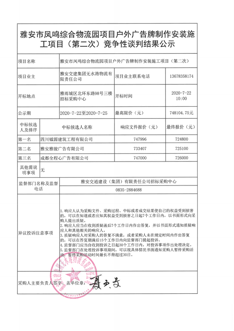 雅安交建集團無水港物流有限責(zé)任公司雅安市鳳鳴綜合物流園項目戶外廣告牌制作安裝施工項目(第二次)競爭性談判結(jié)果公示