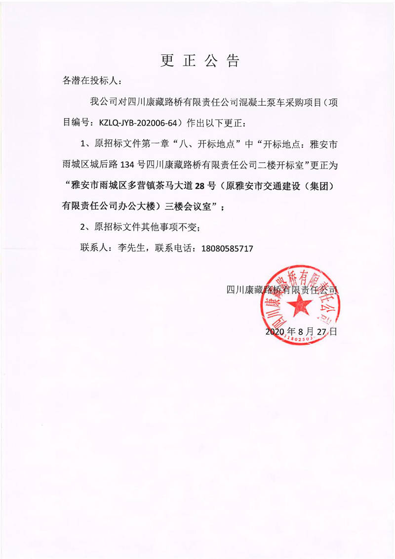 四川康藏路橋有限責(zé)任公司混凝土泵車采購項目更正公告