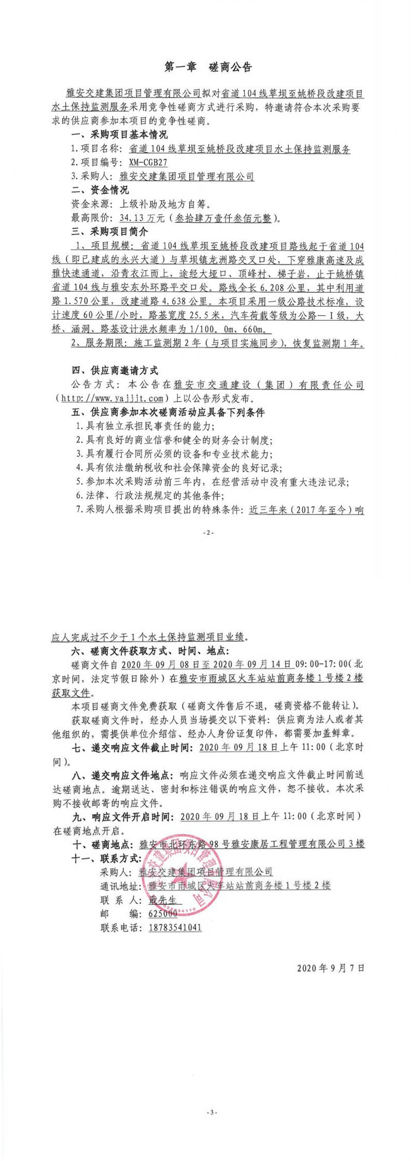 雅安交建集團項目管理有限公司省道104線草壩至姚橋段改建項目水土保持監(jiān)測服務(wù)競爭性磋商公告
