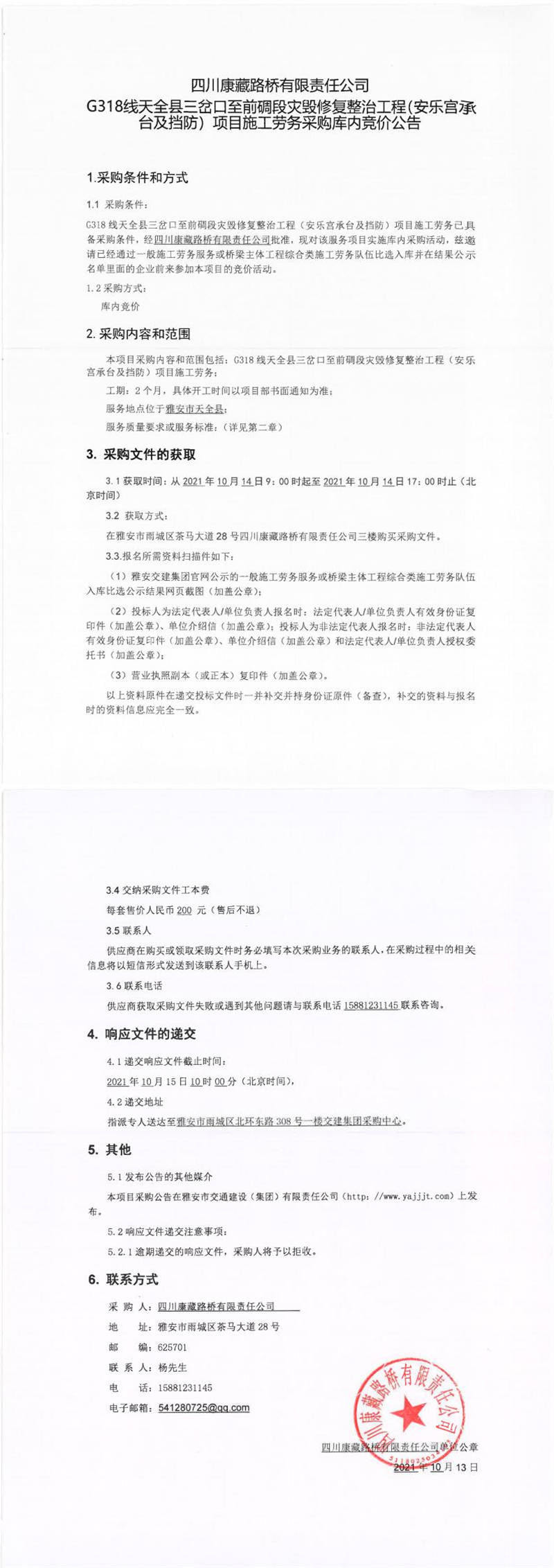 四川康藏路橋有限責任公司G318線天全縣三岔口至前碉段災毀修復整治工程(安樂宮承臺及擋防)項目施工勞務采購庫內(nèi)競價公告