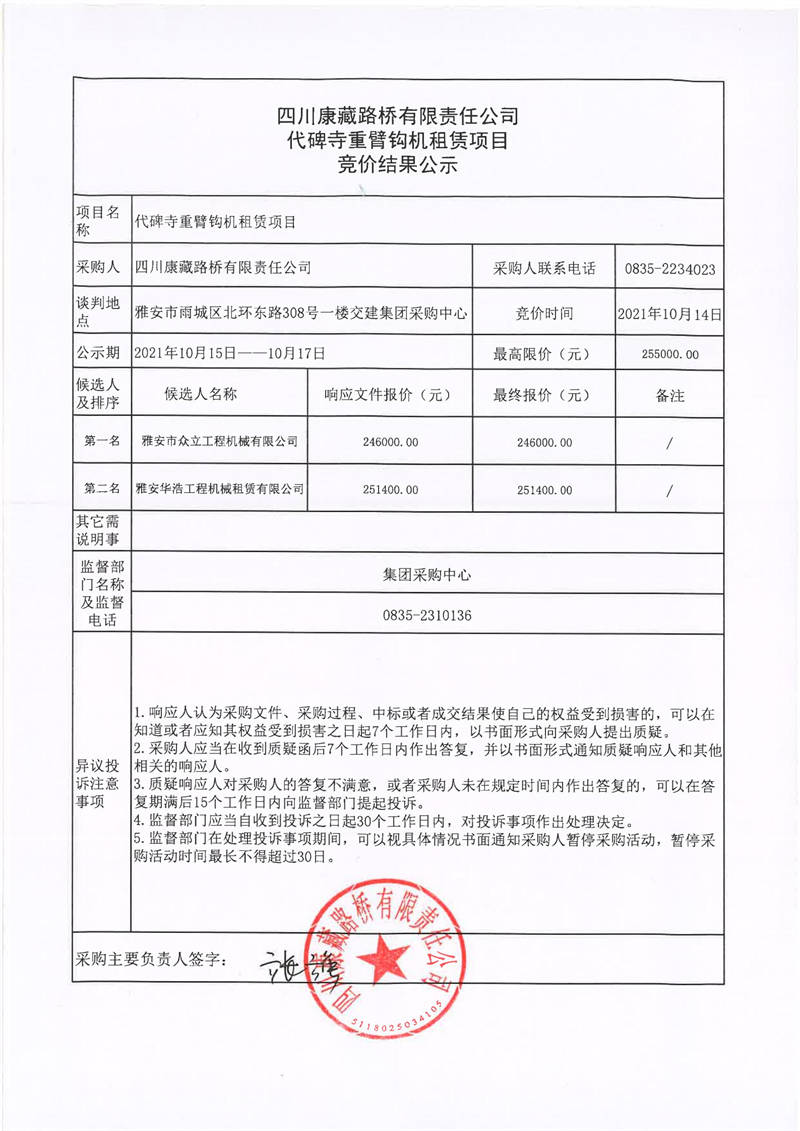 四川康藏路橋有限責任公司代碑寺重臂鉤機租賃項目競價結果公示