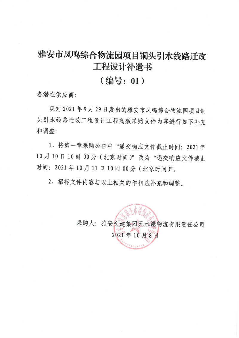 雅安交建集團無水港物流有限責任公司雅安市鳳鳴綜合物流園項目銅頭引水線路遷改工程設(shè)計補遺書