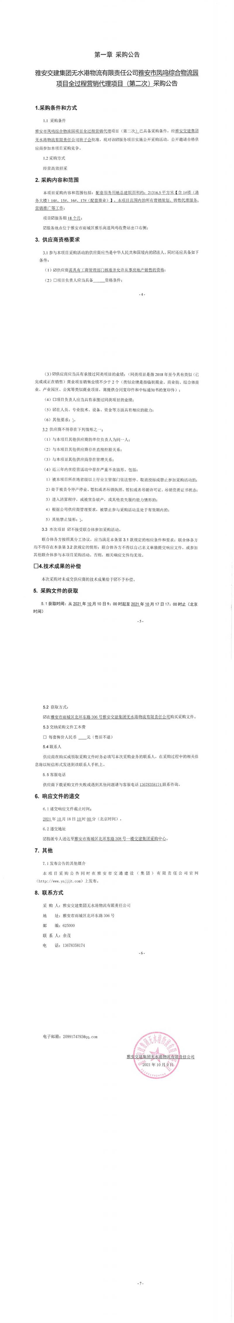 雅安交建集團(tuán)無(wú)水港物流有限責(zé)任公司雅安市鳳鳴綜合物流園項(xiàng)目全過(guò)程營(yíng)銷(xiāo)代理項(xiàng)目(第二次)采購(gòu)公告