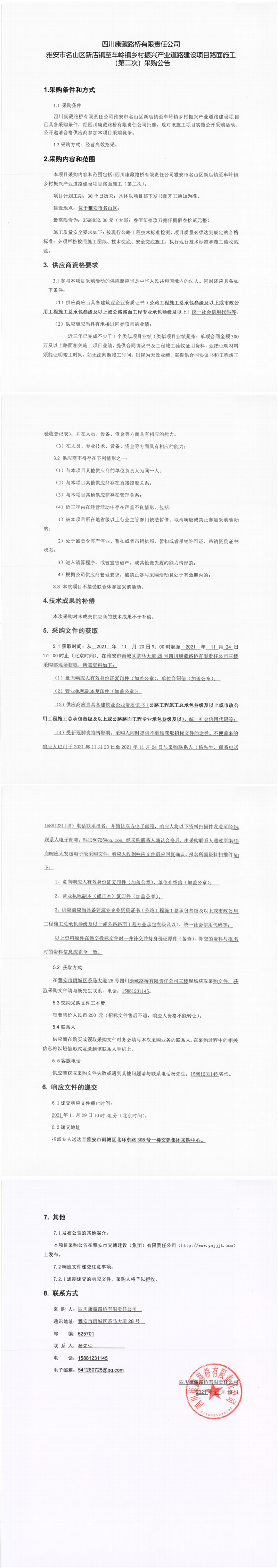 四川康藏路橋有限責(zé)任公司雅安市名山區(qū)新店鎮(zhèn)至車嶺鎮(zhèn)鄉(xiāng)村振興產(chǎn)業(yè)道路建設(shè)項(xiàng)目路面施工(第二次)采購(gòu)公告