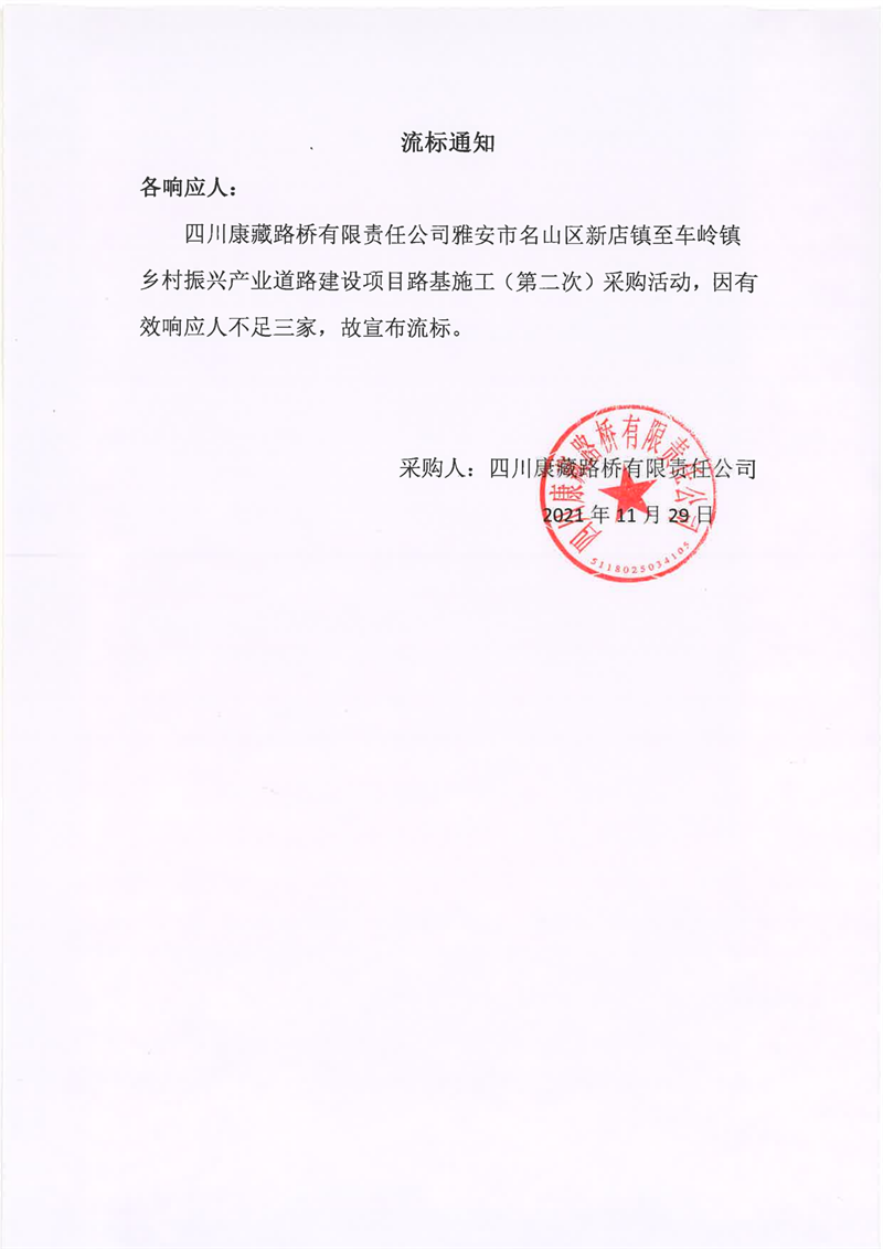 四川康藏路橋有限責(zé)任公司雅安市名山區(qū)新店鎮(zhèn)至車嶺鎮(zhèn)鄉(xiāng)村振興產(chǎn)業(yè)道路建設(shè)項目路面施工(第二次)流標(biāo)通知