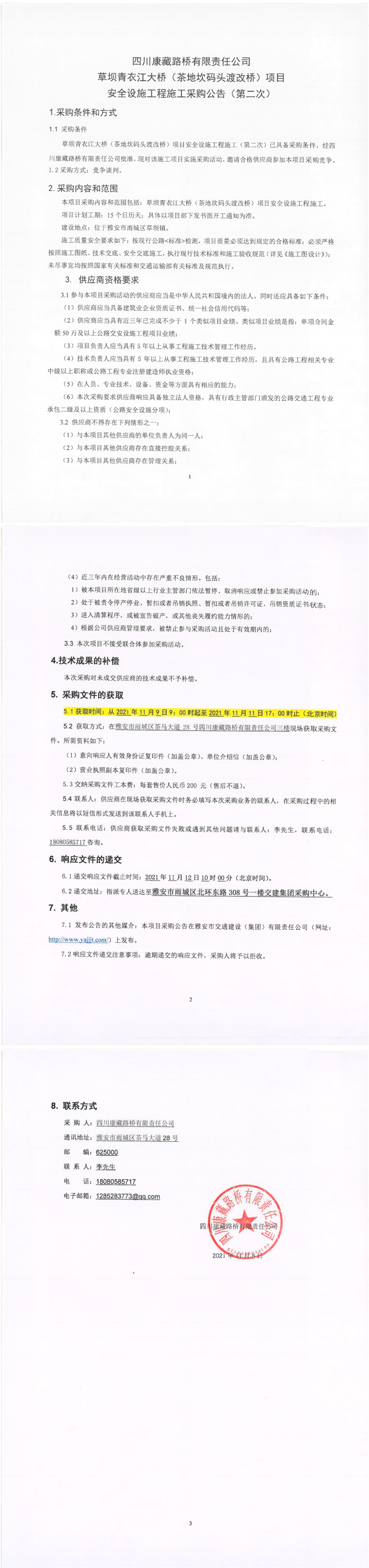 四川康藏路橋有限責(zé)任公司草壩青衣江大橋(茶地坎碼頭渡改橋)項(xiàng)目安全設(shè)施工程施工采購(gòu)公告(第二次)