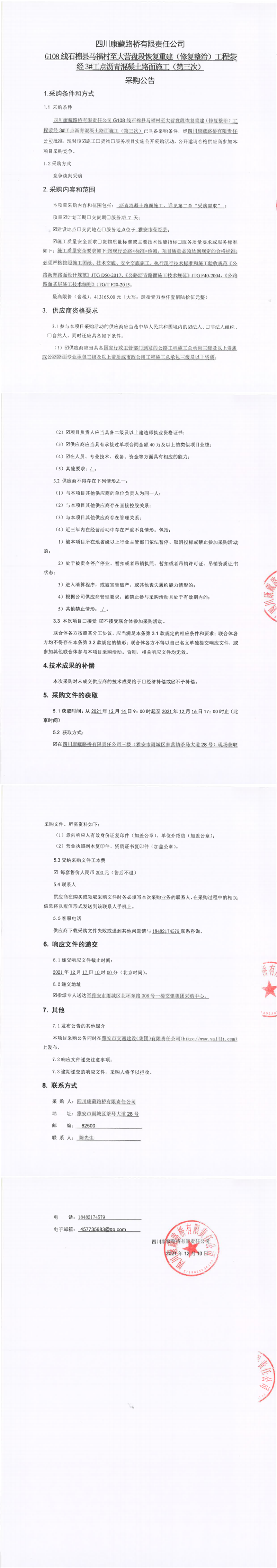 四川康藏路橋有限責(zé)任公司G108線石棉縣馬福村至大營盤段恢復(fù)重建(修復(fù)整治)工程滎經(jīng)3#工點瀝青混凝土路面施工(第三次)采購公告