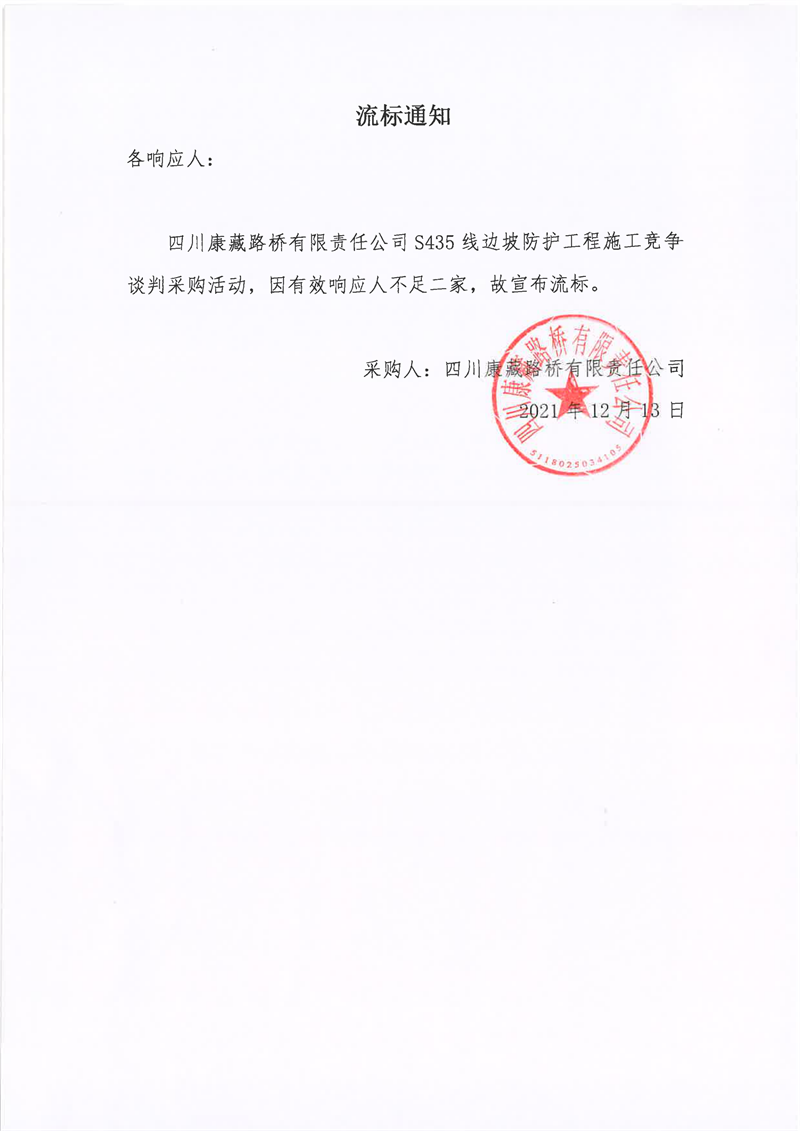 四川康藏路橋有限責(zé)任公司S435線邊坡防護(hù)工程施工采購(gòu)流標(biāo)通知