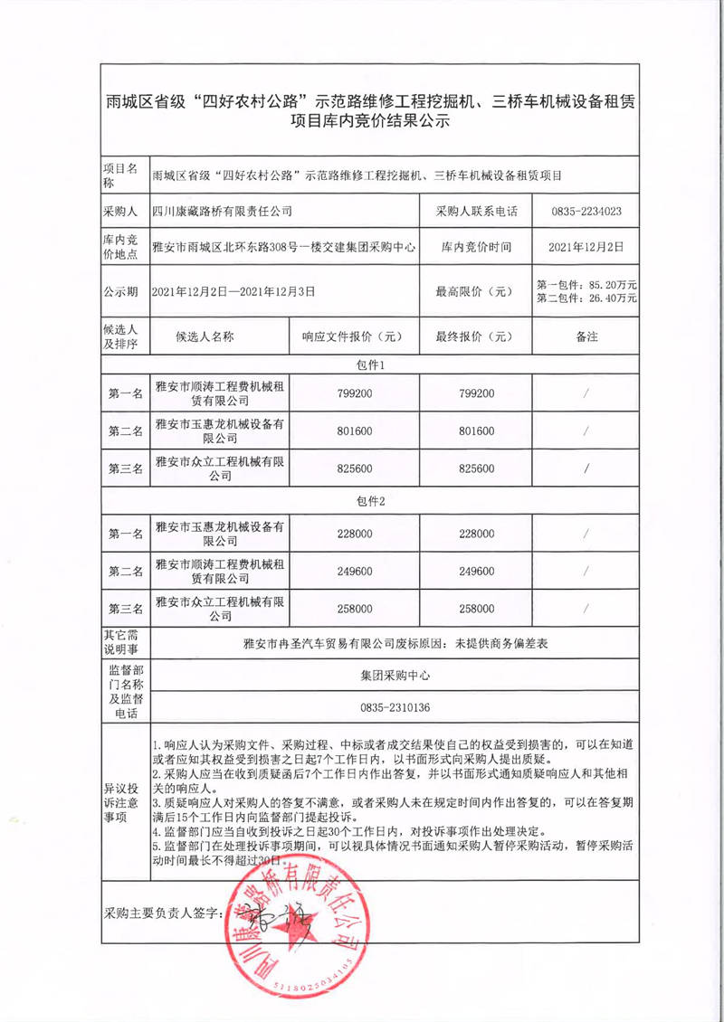 四川康藏路橋有限責(zé)任公司雨城區(qū)省級(jí)“四好農(nóng)村路”示范路維修工程挖掘機(jī)、三橋車機(jī)械設(shè)備租賃項(xiàng)目庫內(nèi)競(jìng)價(jià)結(jié)果公示